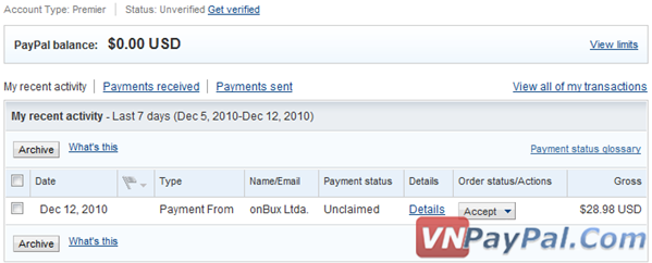 Với các tài khoản chưa được xác nhận, sẽ có trường hợp tuy đã nhận tiền nhưng vẫn chưa được cộng vào PayPal Balance. Lúc ấy, bạn xem trong danh sách giao dịch, tìm giao dịch chưa được cộng tiền, tại cột Order status/Actions bạn bấm chọn Accept là xong. Lưu ý: nếu bạn không chọn Accept thì tiền sẽ được trả lại cho người gửi sau 30 ngày.